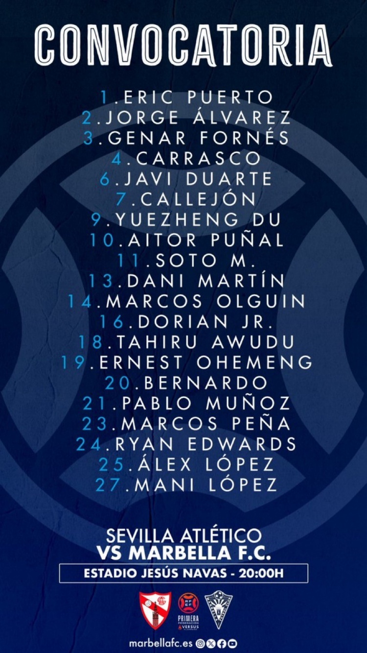 3月29日訊 馬貝拉公布了客場對陣塞維利亞競技的比賽大名單,中國球員杜月徵入選。