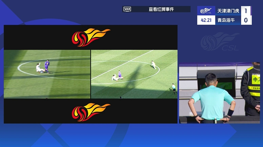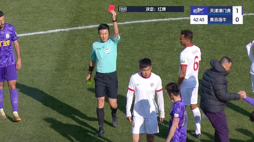 03月29日訊 中超第三輪,津門虎vs海牛。第42分鐘,海牛后衛(wèi)金洋洋飛鏟哈達(dá)斯,主裁起初出示黃牌,VAR介入后主裁改判紅牌將其罰下!