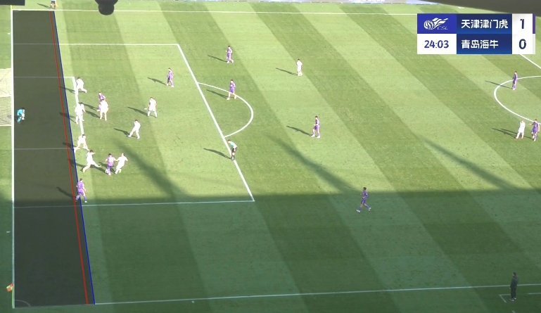 比賽第23分鐘,巴頓禁區(qū)內(nèi)抽射破門,隨后VAR介入,判罰阿代米在接應(yīng)王秋明傳球時越位在先,進球無效。場上比分仍為津門虎1-0海牛。