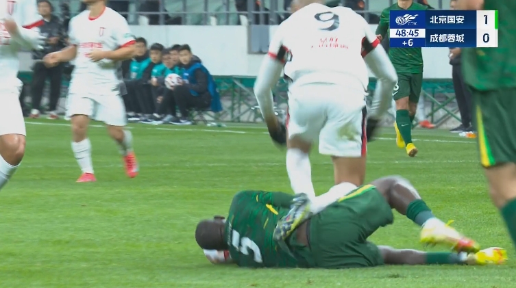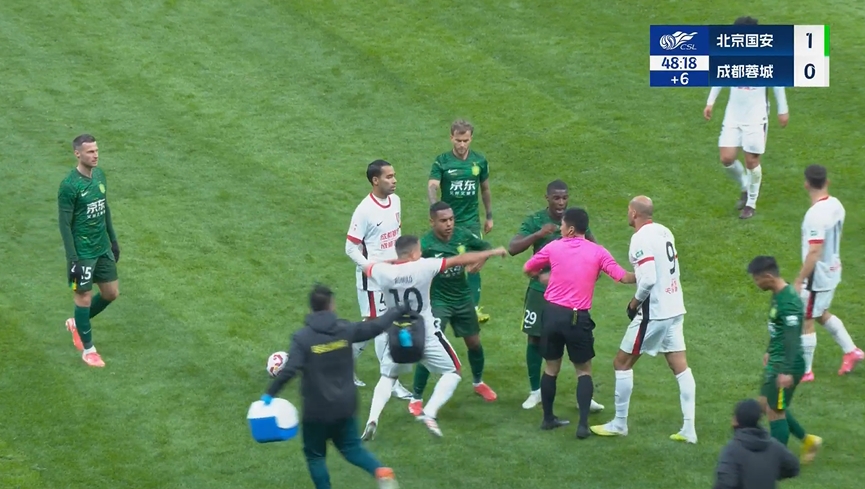 比賽上半場補(bǔ)時(shí)階段,費(fèi)利佩倒地時(shí)踩到恩加德烏腹部,兩隊(duì)爆發(fā)沖突,馬寧趕緊拉開兩方球員。場上比分國安1-0蓉城。