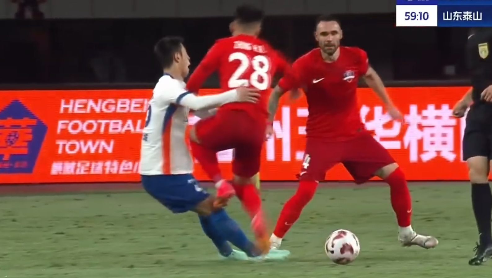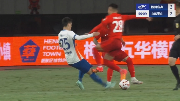 03月29日訊 泰山vs梅州第60分鐘,鐘浩然跳起搶斷,鞋底踩著彭欣力膝蓋起飛!但是裁判沒有響哨!