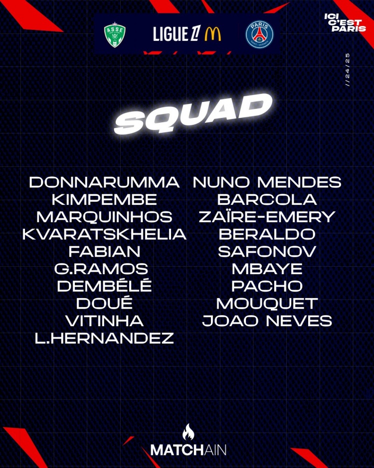 巴黎對(duì)陣圣埃蒂安名單: