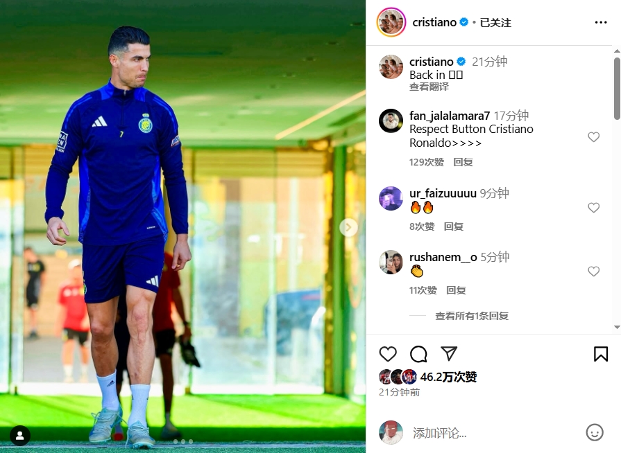回歸訓(xùn)練!C羅社媒曬照身穿利雅得勝利訓(xùn)練服,配文:Back in