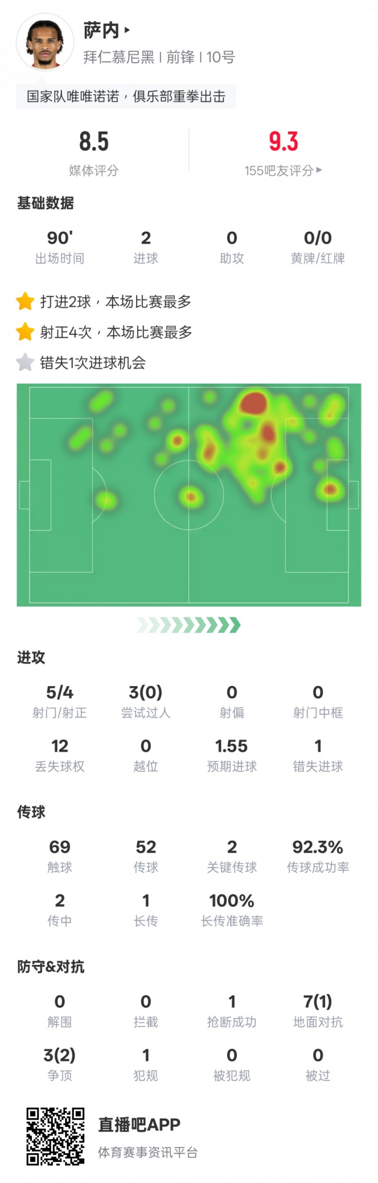 薩內(nèi)本場數(shù)據(jù):2進球2關(guān)鍵傳球&錯失1次進球機會,評分8.5