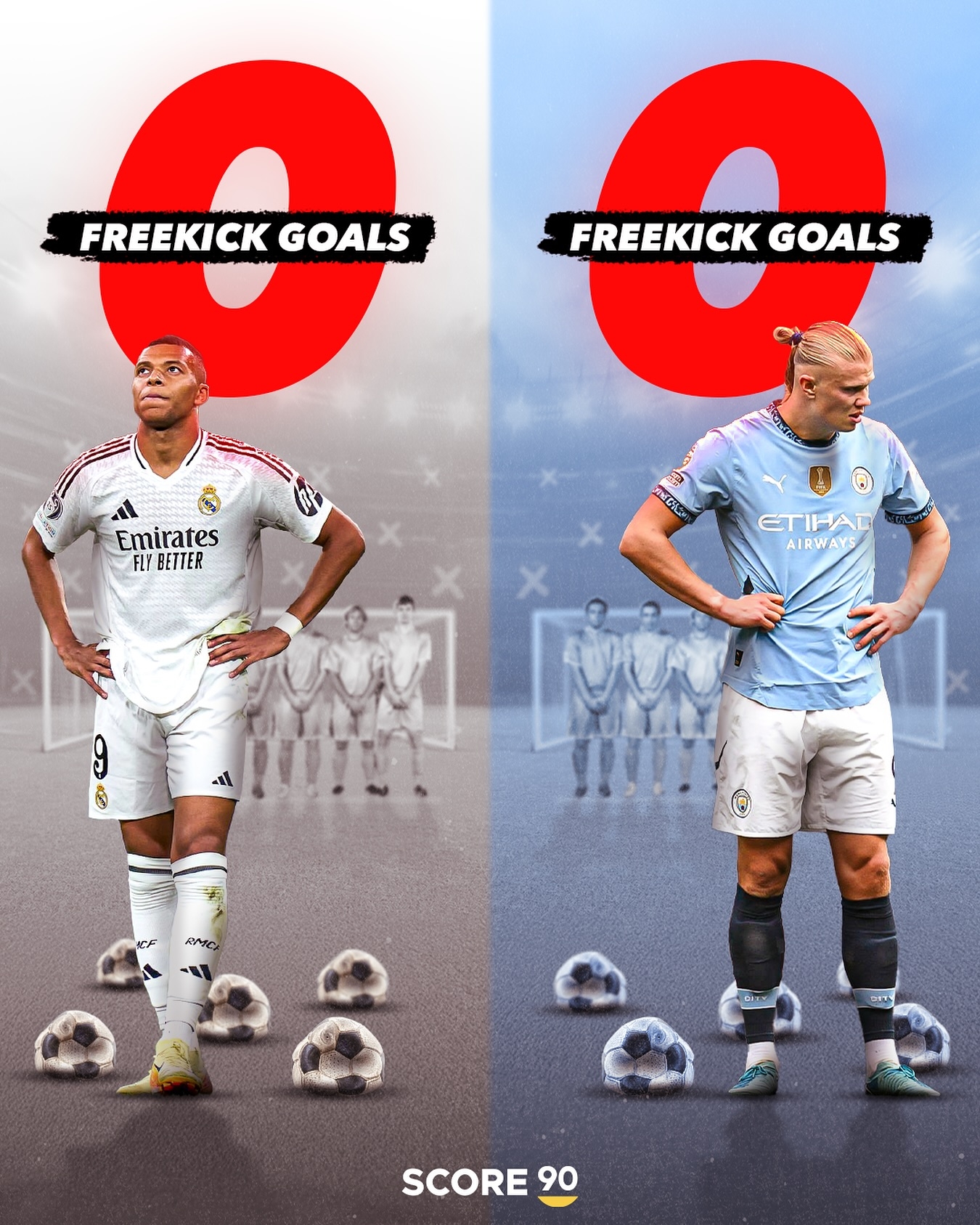 不只是姆巴佩,新雙驕的另一位——哈蘭德,也從未有過(guò)任意球破門(mén)。