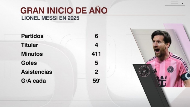 據(jù)ESPN統(tǒng)計,梅西今年出戰(zhàn)6場比賽,其中4場首發(fā),出場時間411分鐘,打進5球助攻2次,平均每59分鐘參與1球。