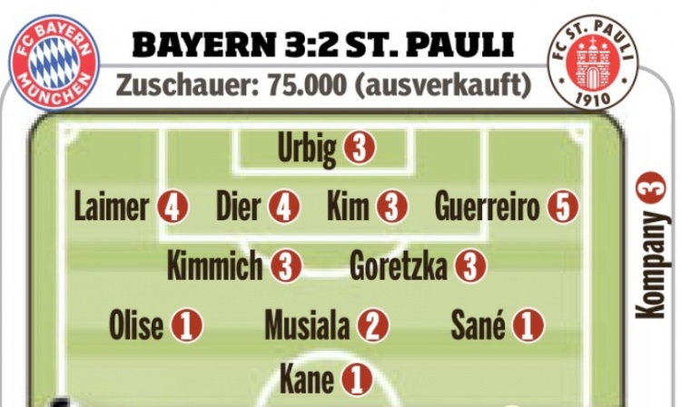 3月30日訊 拜仁在本輪德甲3-2險勝圣保利,《圖片報》也在賽后為球員進行了評分。