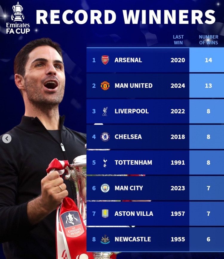 德轉(zhuǎn)列足總杯歷史奪冠榜:阿森納壓曼聯(lián)居首,曼城&維拉各7冠