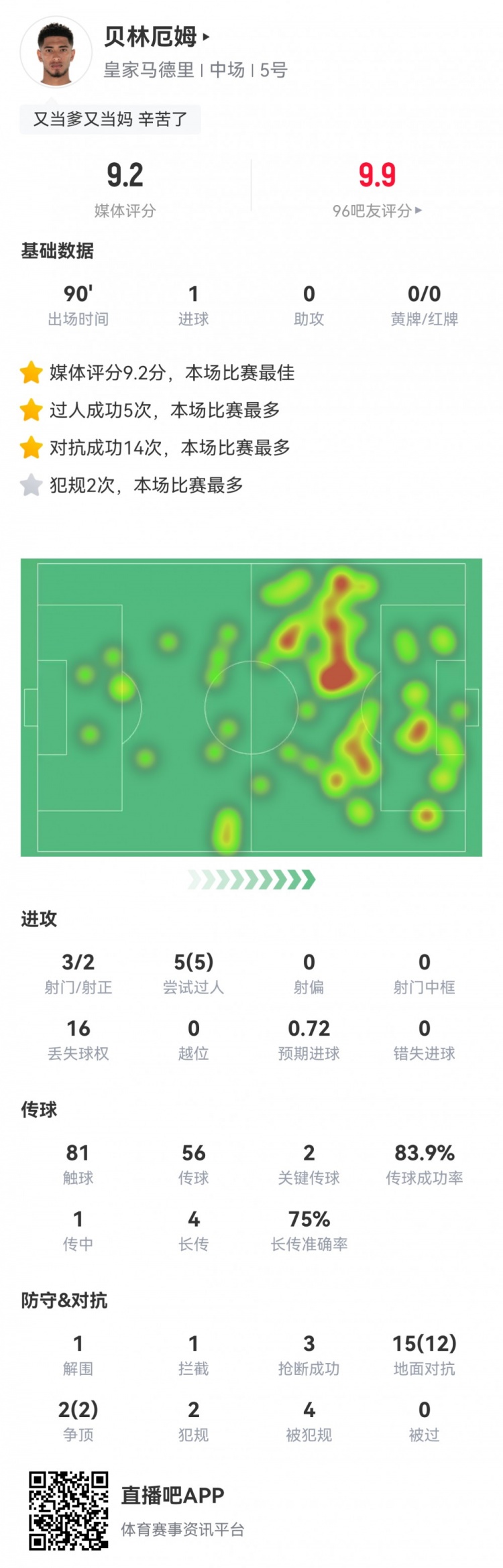 貝林數(shù)據(jù):1進球,5次過人全成功,14次成功對抗,全場最高9.2分