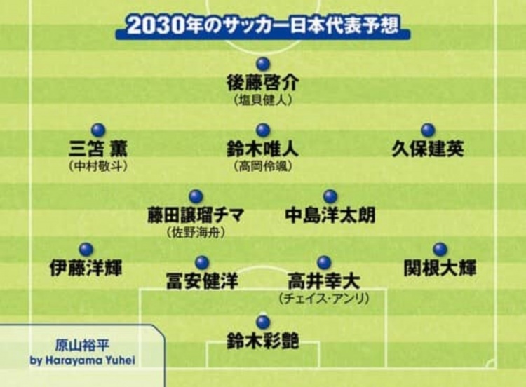 3月30日訊 據(jù)日媒Sportiva報(bào)道,近日該媒體開(kāi)設(shè)專(zhuān)欄,開(kāi)始對(duì)2030年世界杯日本隊(duì)首發(fā)陣容預(yù)測(cè),有部分日本國(guó)內(nèi)的自由撰稿人投稿對(duì)首發(fā)進(jìn)行預(yù)測(cè)。以上撰稿人預(yù)測(cè)的陣容中,基本都是本期日本國(guó)家隊(duì)陣中的年輕球員,并結(jié)合部分現(xiàn)役U22國(guó)家隊(duì)、U20國(guó)家隊(duì)球員等組合而成。