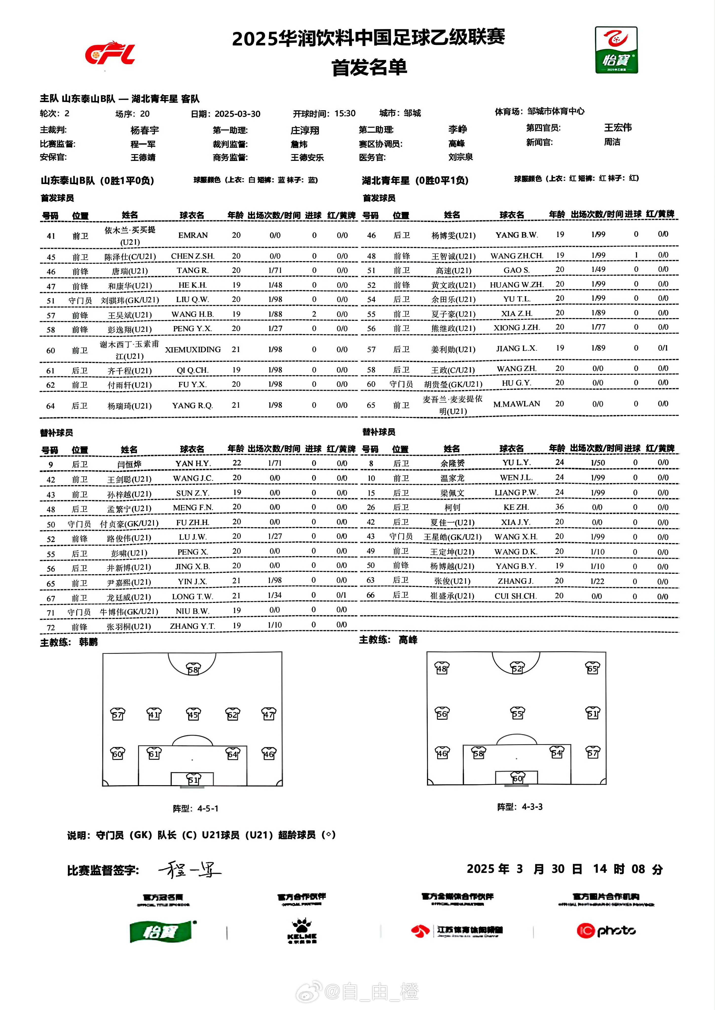 03月30日訊 今日下午進行的中乙第2輪比賽,山東泰山B隊vs湖北青年星,依木蘭、陳澤仕先發(fā),因年齡造假被禁賽3個月的謝木西丁解禁復(fù)出后繼續(xù)首發(fā)。