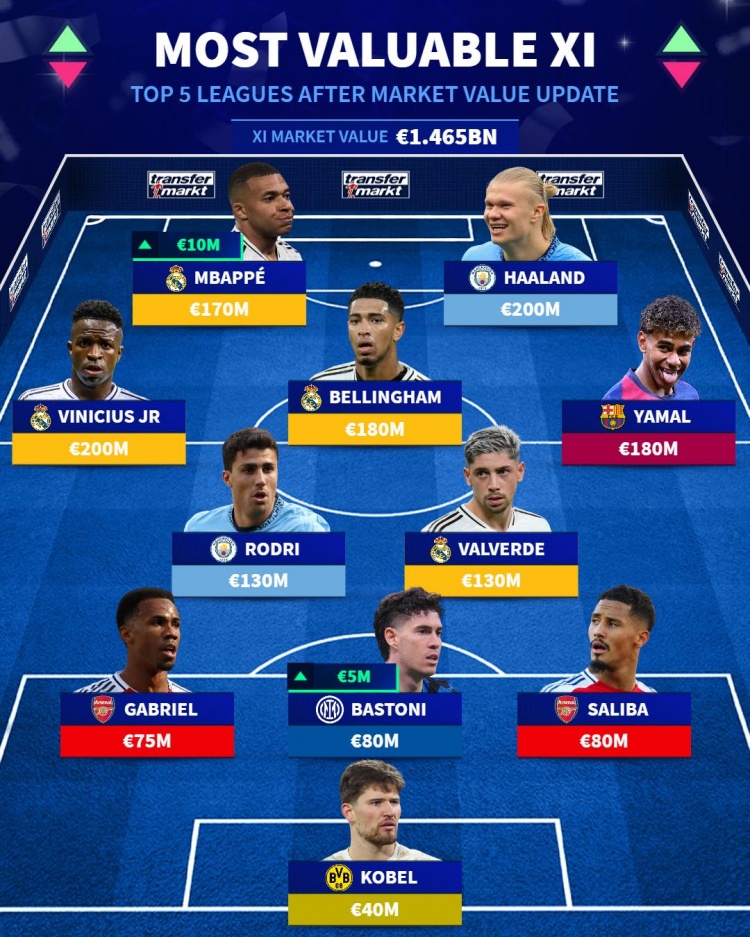 五大聯(lián)賽身價最高陣:哈蘭德、姆巴佩、亞馬爾在列,總價超14億歐