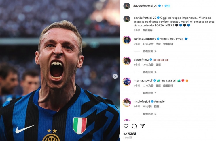 弗拉泰西也在賽后通過社媒曬出自己的怒吼慶祝照,并配文:“今天(的勝利)太重要了……如果我有時(shí)踢得不太好,我對(duì)此非常抱歉。但那些了解我的人都清楚發(fā)生了什么。加油,國(guó)際米蘭!”