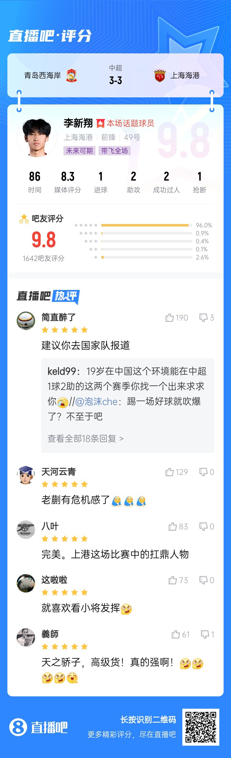 19歲的海港“小孩哥”中超首次先發(fā)1射2傳,讓衛(wèi)冕冠軍極限客場(chǎng)戰(zhàn)平西海岸,似乎又讓球迷看到了一顆未來冉冉升起的新星,看到新的希望!