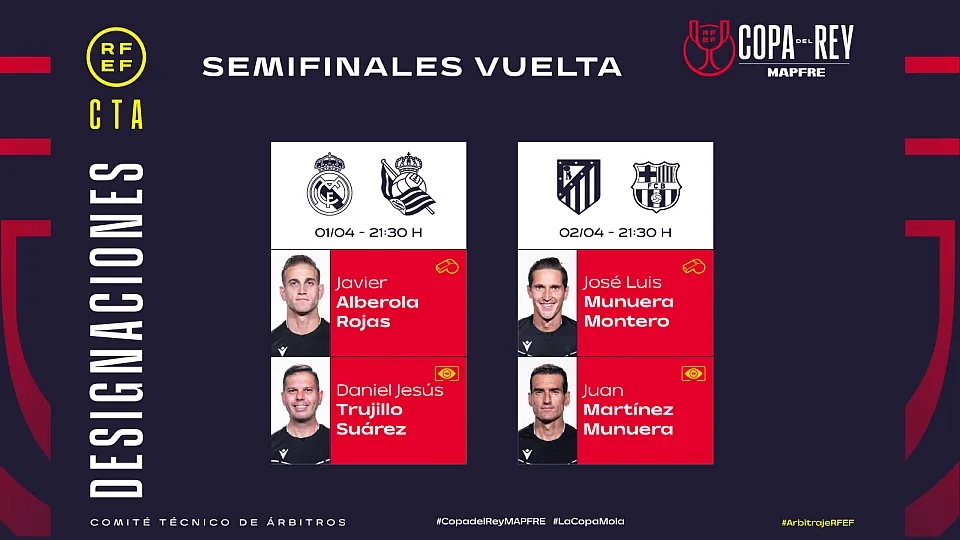 國(guó)王杯半決賽次回合裁判:羅哈斯執(zhí)法皇馬,蒙特羅吹巴薩vs馬競(jìng)