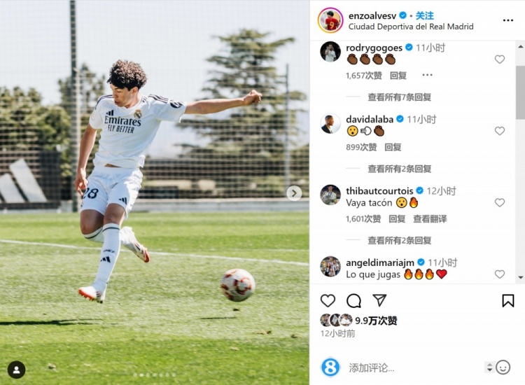 3月31日訊 馬塞洛15歲兒子恩佐-阿爾維斯社媒慶祝上演皇馬U19首秀,羅德里戈、阿拉巴、庫爾圖瓦、迪馬利亞留言鼓勵。