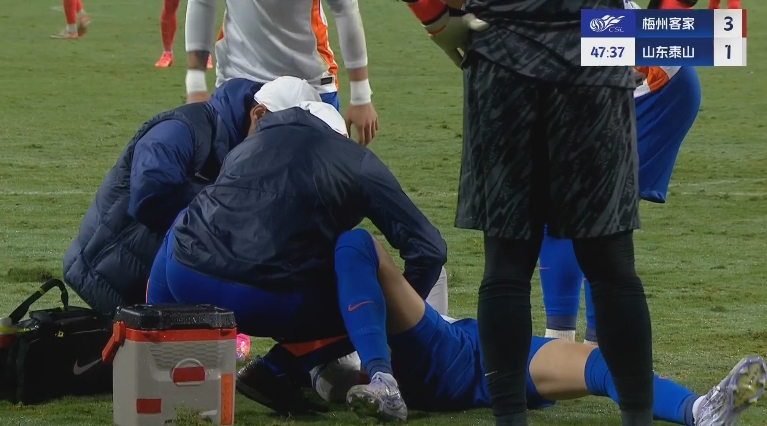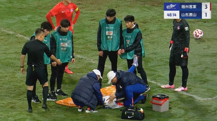 3月29日進(jìn)行的中超第3輪比賽,泰山vs梅州第50分鐘,王彤遠(yuǎn)射后為了躲避封堵失去平衡摔地,隨后被擔(dān)架抬下,張弛替補(bǔ)登場(chǎng)。