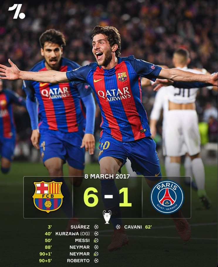 3月8日訊 在2017年的今天,巴薩在歐冠淘汰賽次回合以6-1大勝巴黎,成為歐冠歷史首支首回合0-4落后最終逆轉(zhuǎn)晉級的球隊。