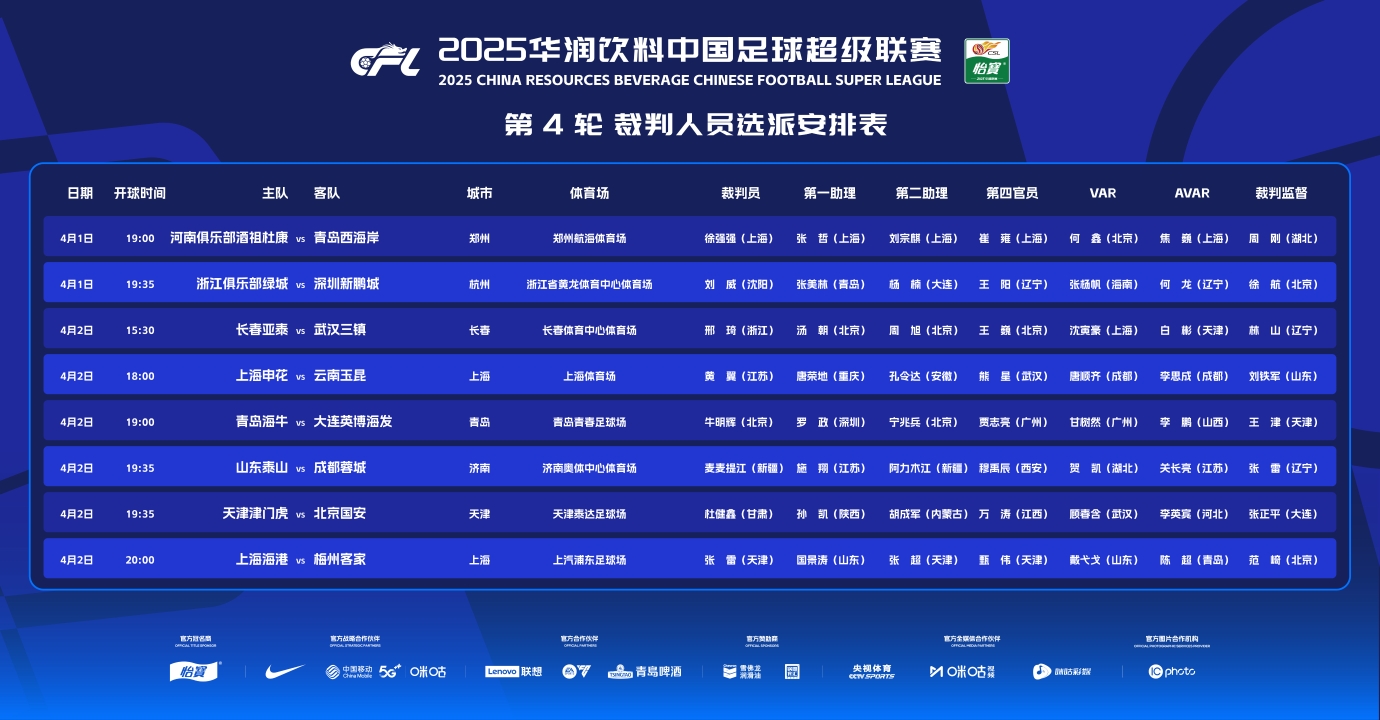 04月01日訊 中足聯(lián)公布2025賽季中超第4輪裁判選派安排,麥麥提江主哨泰山vs蓉城,馬寧本輪比賽無(wú)執(zhí)法任務(wù)。