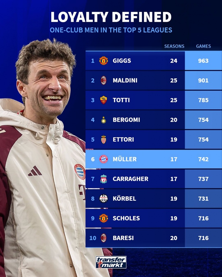4月1日訊 德國轉(zhuǎn)會(huì)市場統(tǒng)計(jì)了五大聯(lián)賽歷史一人一城球員的出場次數(shù),并列出榜單,吉格斯、馬爾蒂尼、托蒂位居前三,穆勒排名第6位。