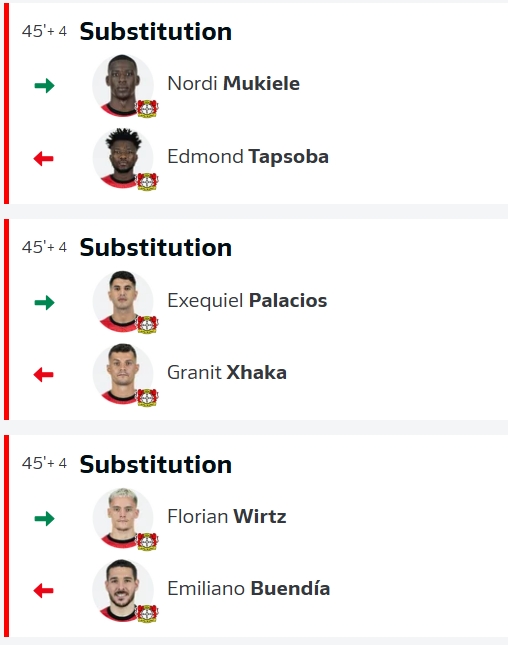 03月08日訊 德甲第25輪,勒沃庫(kù)森vs不萊梅。比賽下半場(chǎng),勒沃庫(kù)森連換三人,維爾茨、帕拉西奧斯、穆基勒出場(chǎng),換下布恩迪亞、扎卡以及塔普索巴。
