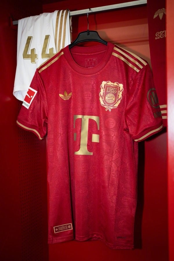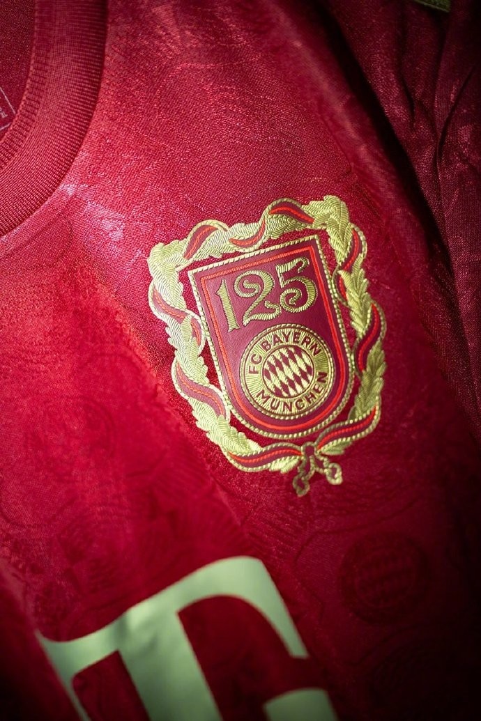 這款獨(dú)特的特別版球衣延續(xù)了傳統(tǒng)的紅色,并配以金色的品牌標(biāo)志。此外所設(shè)計(jì)的紀(jì)念徽章則融入了成立文件中的元素、盾形紋章以及巴伐利亞的月桂花環(huán)元素,金色的細(xì)節(jié)則為設(shè)計(jì)增添了現(xiàn)代感。