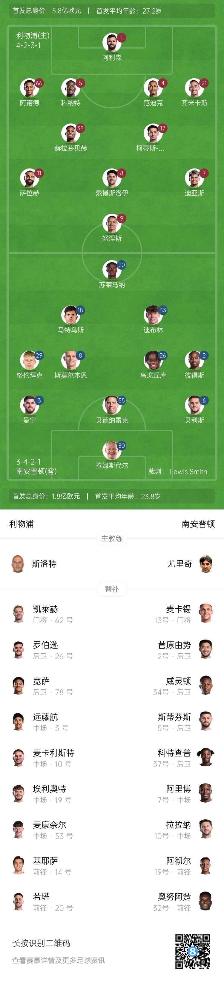 利物浦首發(fā):1-阿利森、4-范迪克、5-科納特、21-齊米卡斯、66-阿諾德、8-索博斯洛伊、17-柯蒂斯-瓊斯、38-赫拉芬貝赫、7-路易斯-迪亞斯、9-努涅斯、11-薩拉赫