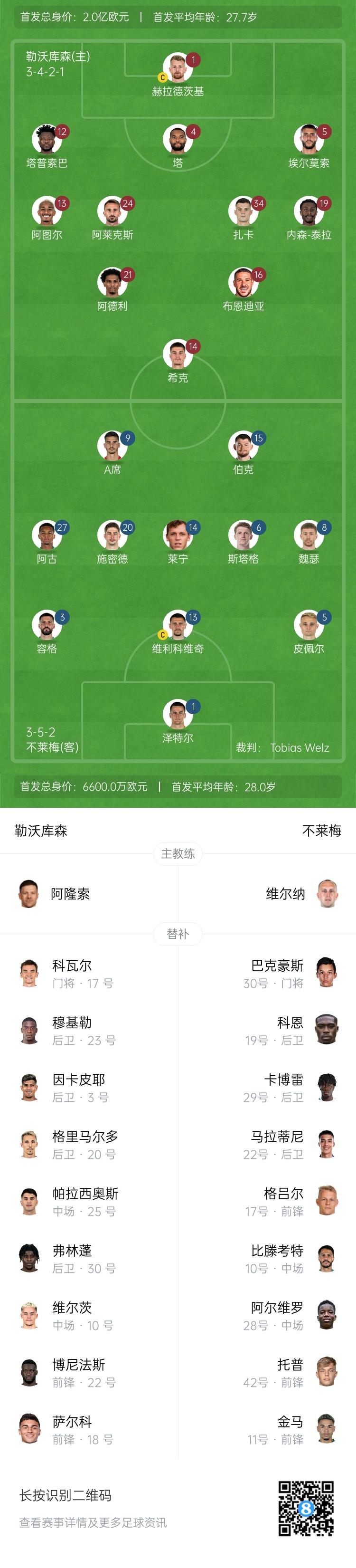 勒沃庫(kù)森替補(bǔ):17-科瓦爾、3-因卡皮耶、10-維爾茨、18-薩爾科、20-格里馬爾多、22-博尼法斯、23-穆基勒、25-帕拉西奧斯、30-弗林蓬