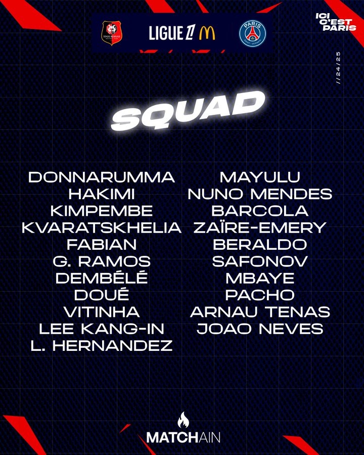 3月8日訊 北京時間明天凌晨0點,巴黎圣日耳曼將在法甲第25輪客場挑戰(zhàn)雷恩,球隊今天公布了大名單。