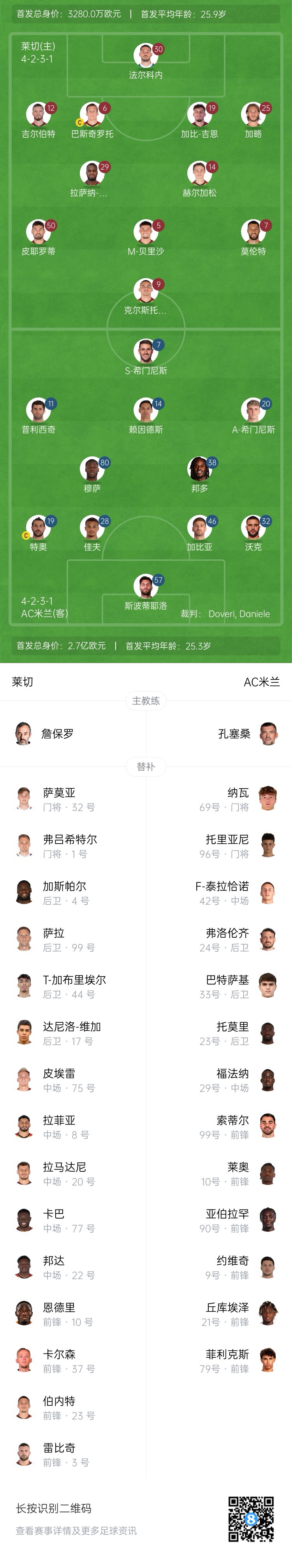 米蘭替補(bǔ):69-拉波-納瓦、96-托里亞尼、42-泰拉恰諾、24-弗洛倫奇、33-巴特薩基、23-托莫里、29-福法納、99-索蒂爾、10-萊奧、90-亞伯拉罕、9-約維奇、21-丘庫(kù)埃澤、79-菲利克斯