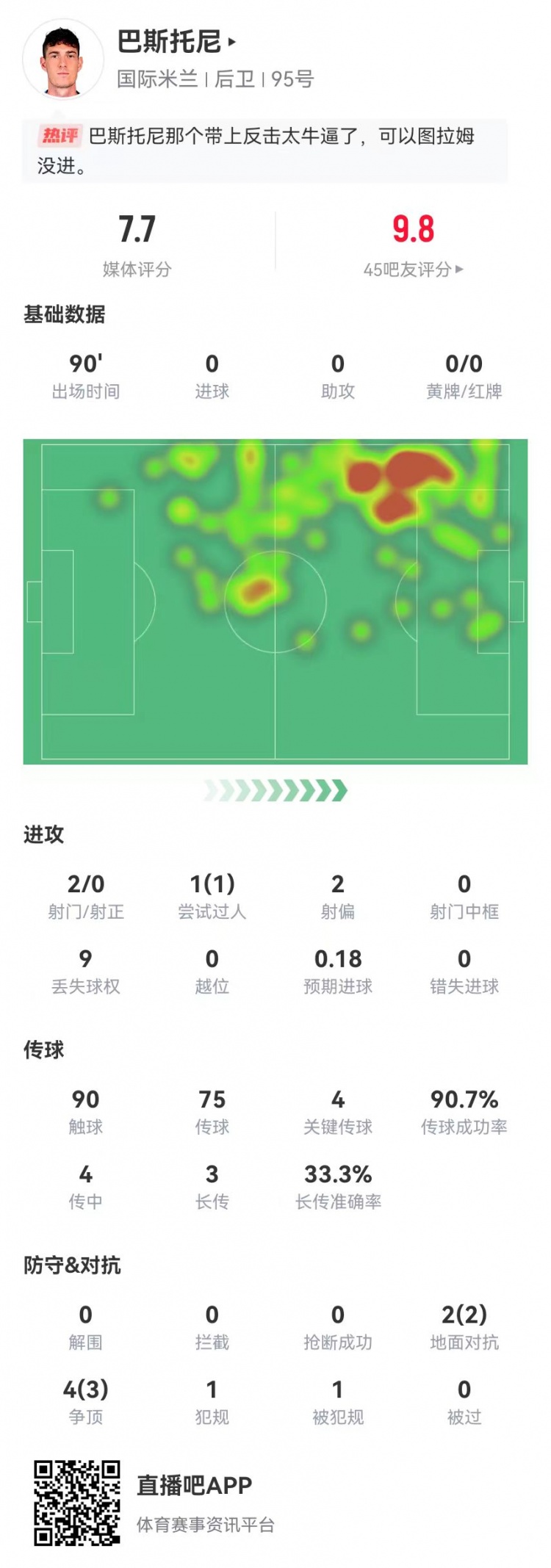 巴斯托尼客串左翼衛(wèi)數(shù)據(jù):4關(guān)鍵傳球+2射門 6對(duì)抗5成功 獲評(píng)7.7分