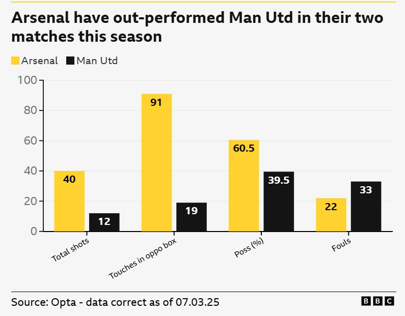 一邊倒?BBC:阿森納本賽季兩次交手曼聯(lián),多項(xiàng)關(guān)鍵數(shù)據(jù)占優(yōu)