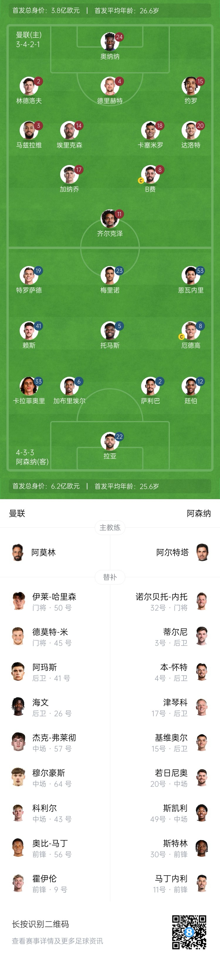 曼聯(lián)首發(fā):24-奧納納、2-林德洛夫、4-德里赫特、15-約羅、3-馬茲拉維、20-達洛特、14-埃里克森、18-卡塞米羅、8-B費、17-加納喬、11-齊爾克澤
