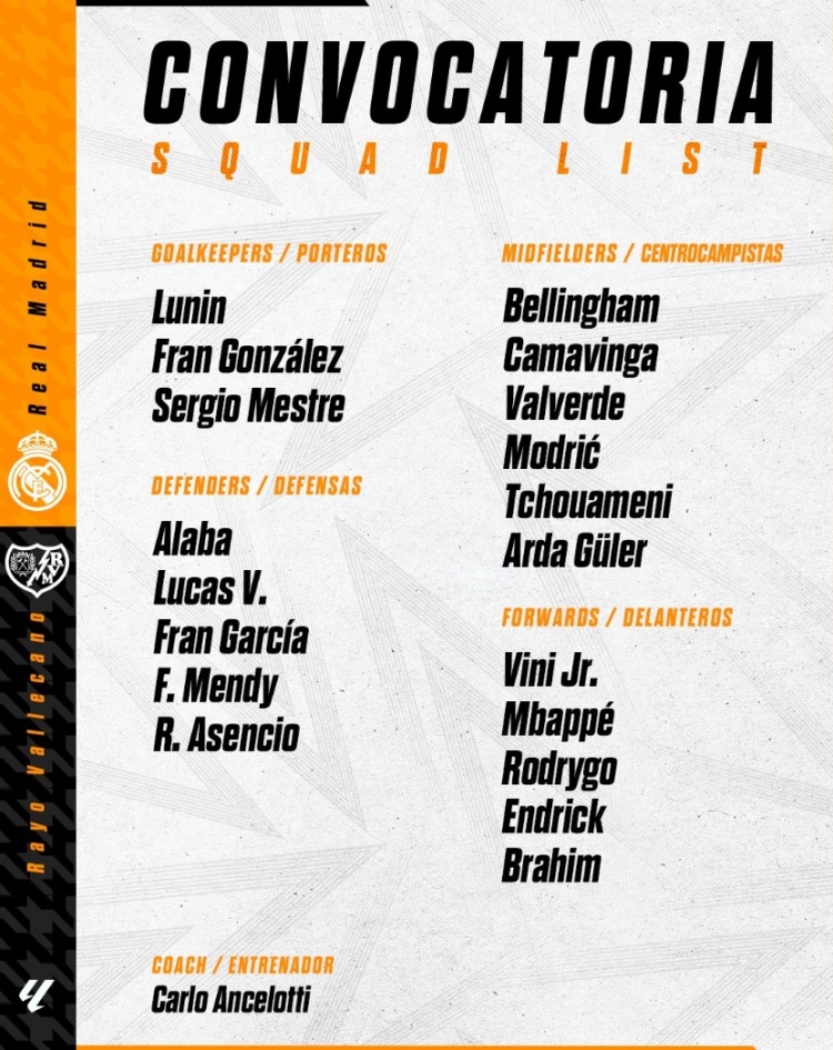 皇馬對(duì)陣巴列卡諾大名單:庫爾圖瓦缺席,姆巴佩&巴爾韋德在列