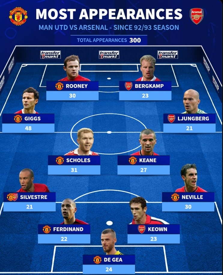 英超時代出戰(zhàn)阿森納VS曼聯(lián)次數(shù)最多陣:魯尼&吉格斯&博格坎普在列