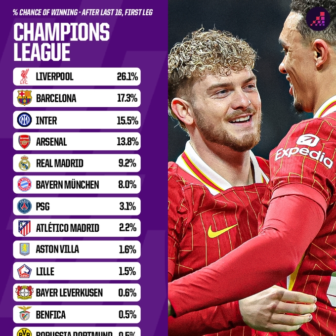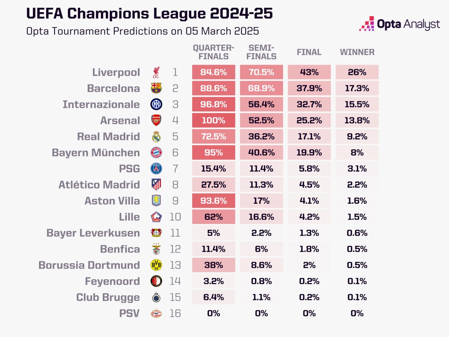 Opta歐冠晉級(jí)概率:利物浦、巴薩有望會(huì)師決賽 國(guó)米、槍手劍指4強(qiáng)
