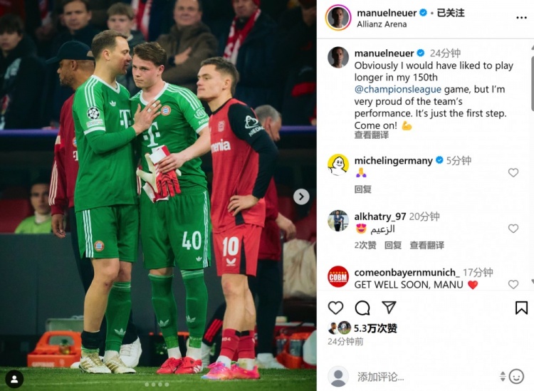 因傷下場(chǎng),諾伊爾社媒曬照:我本希望在第150場(chǎng)歐冠踢更長(zhǎng)時(shí)間