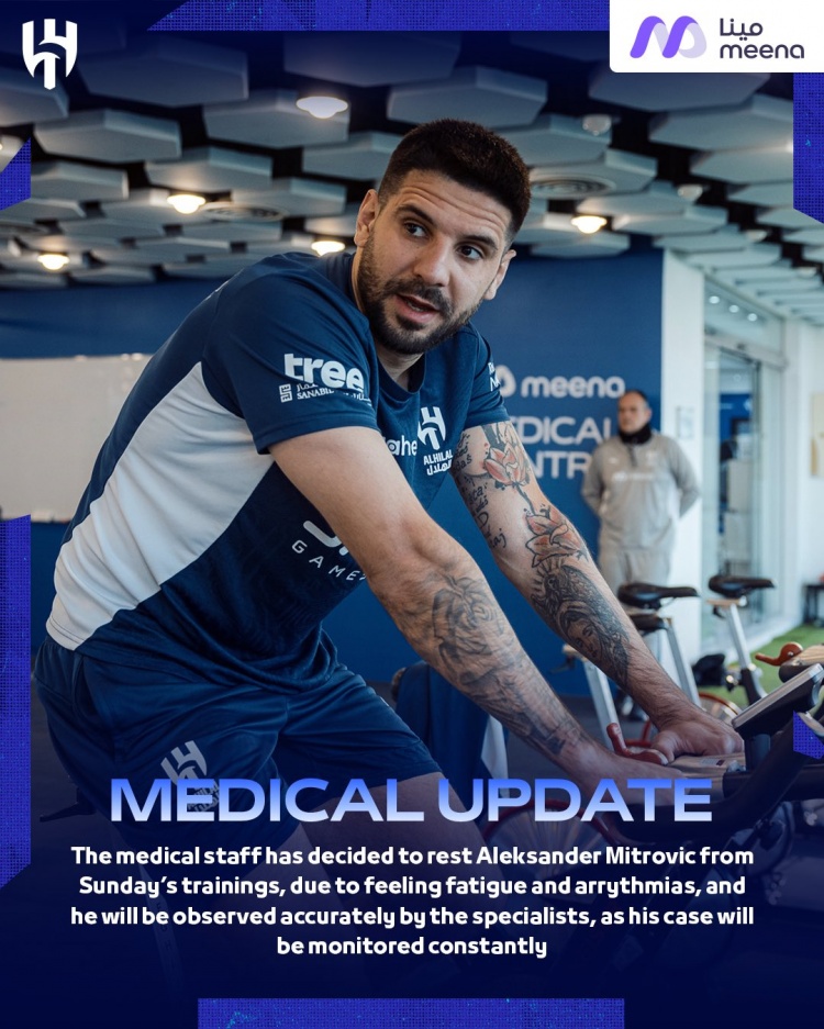 利雅得新月官方寫道:“由于感到疲勞和心律不齊,醫(yī)務(wù)人員決定讓米特洛維奇在周日的訓(xùn)練中休息,專家將對他進行精確觀察,他的情況會得到持續(xù)檢測?!?/p>