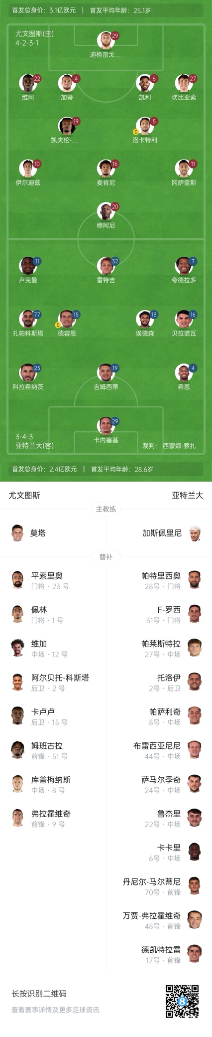 尤文vs亞特蘭大首發(fā):穆阿尼、伊爾迪茲、岡薩雷斯出戰(zhàn)