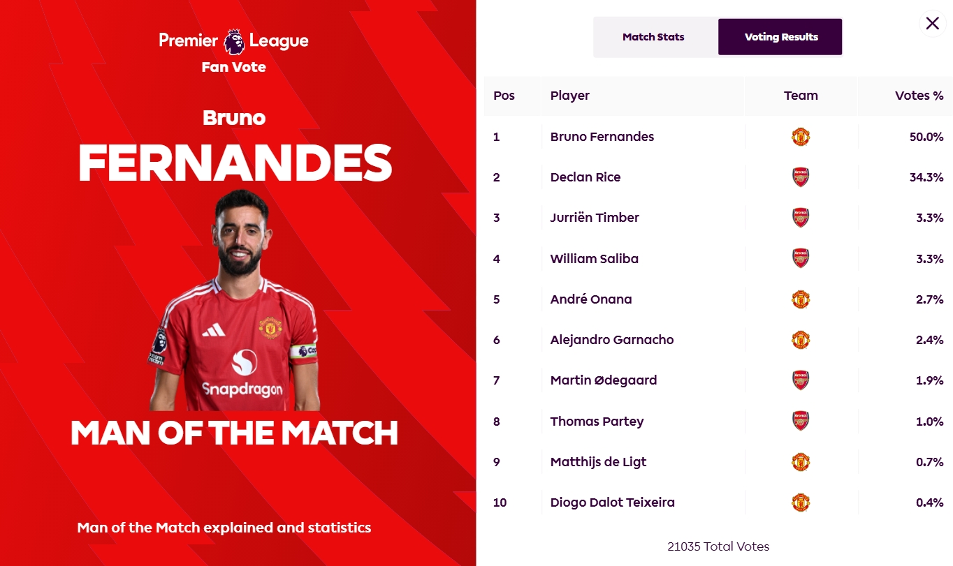 本場比賽,B費打入一個任意球世界波,為曼聯(lián)首開記錄,賽后他獲得50%的票數(shù),被評為全場最佳。