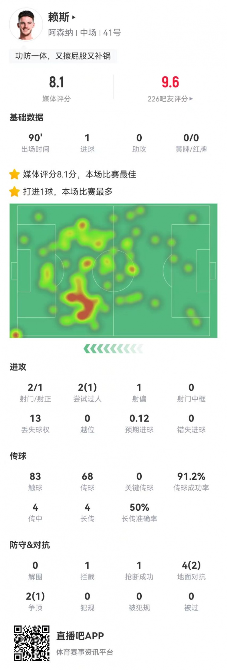 賴斯本場1球+1救險(xiǎn) 6對抗3成功 4傳中0成功 獲評8.1分全場最高