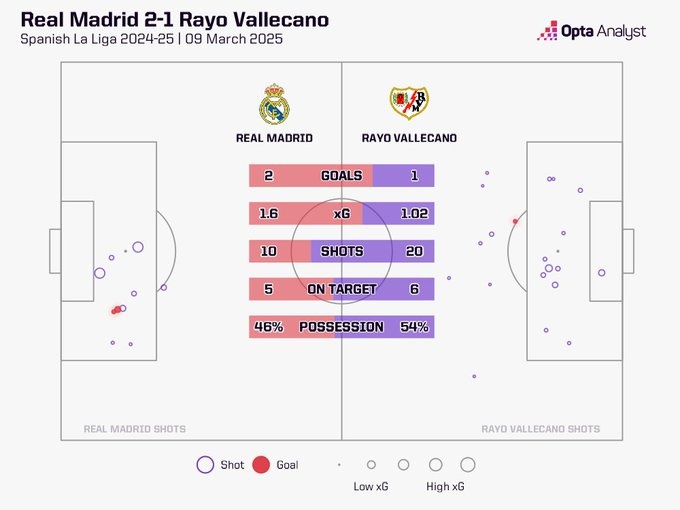 OPTA統(tǒng)計表明,本場比賽巴列卡諾有20次射門,而皇馬只有10次,這是除了面對巴薩之外,皇馬自2008年1月以來在西甲主場與對手最大的射門次數差。