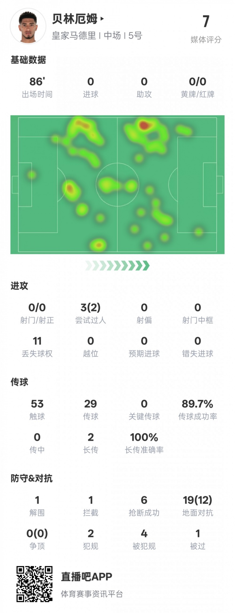 貝林厄姆本場(chǎng)數(shù)據(jù):12次地面對(duì)抗成功2過(guò)人成功6搶斷,評(píng)分7.0