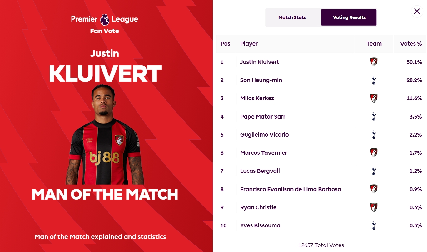 本場比賽伯恩茅斯前鋒小克魯伊維特發(fā)揮出色,送出一次助攻,賽后他也以超過50%的得票率當(dāng)選英超官方球迷票選全場最佳球員。