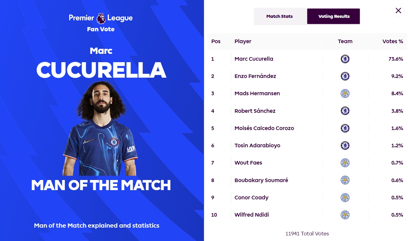 3月10日訊 英超第28輪,切爾西1-0萊斯特城。庫庫雷利亞首發(fā)出戰(zhàn),賽后以73.6%得票率當(dāng)選全場(chǎng)最佳。