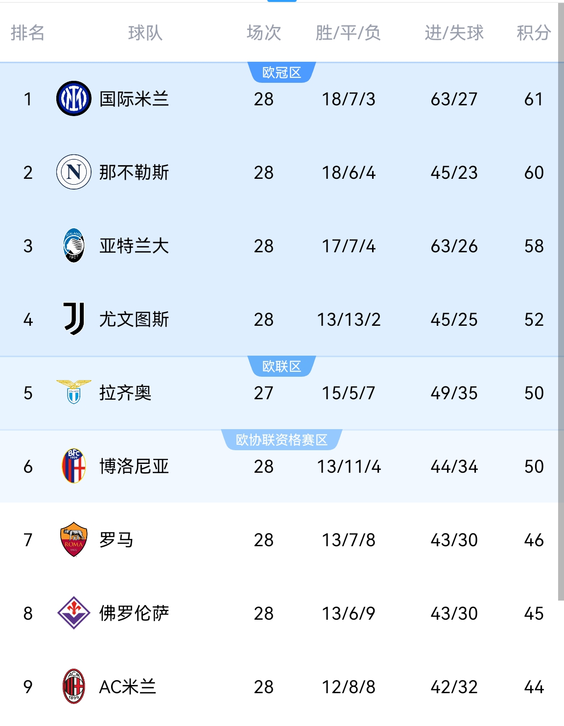 目前尤文聯(lián)賽排名第4,落后榜首9分,領(lǐng)先第5和第6名2分。