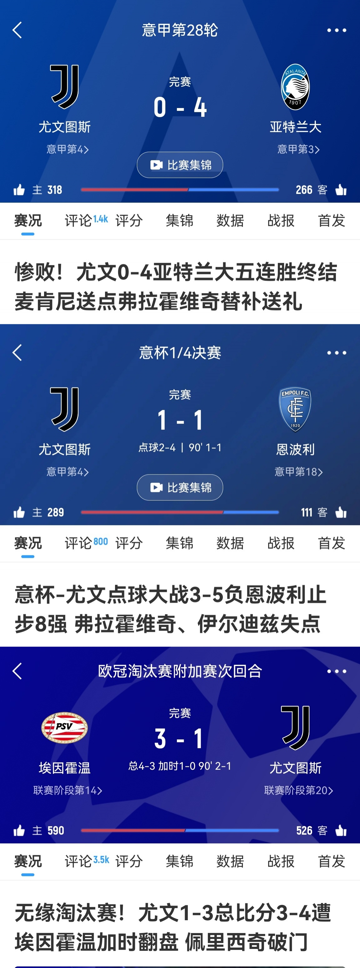 意杯賽場,尤文1/4決賽點球大戰(zhàn)不敵保級隊恩波利。歐冠賽場,球隊1比3被荷甲第2埃因霍溫加時賽翻盤。