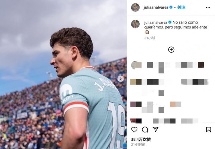 在昨天進行的西甲聯(lián)賽中,馬競1-2遭赫塔費逆轉,阿爾瓦雷斯首發(fā)出戰(zhàn)58分鐘被換下。在個人社媒,他發(fā)文鼓勵球隊:“這沒有按照我們想要的方式進行,但我們會繼續(xù)前進?!?/p>