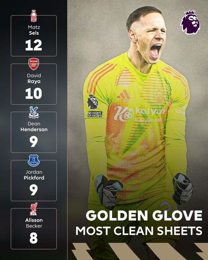 英超官方曬金手套海報:森林門將塞爾斯12零封引領群雄