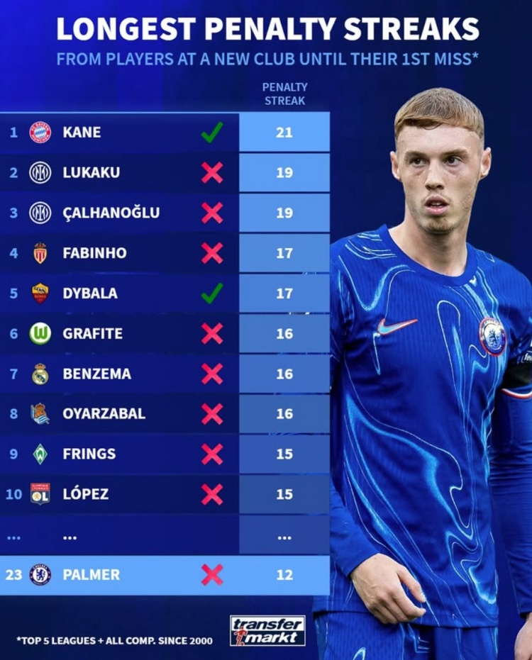 3月11日訊 切爾西在本輪英超1-0小勝萊斯特城,帕爾默罰丟點球,加盟切爾西后連續(xù)12次命中點球紀錄告終。